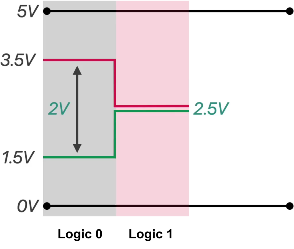 CAN Logic Levels: CAN encodes bits using differential voltage: a dominant ‘0’ is created by driving CAN_H high and CAN_L low (~2 V difference), while a recessive ‘1’ leaves both lines at ~2.5 V (0 V difference), enabling robust noise immunity and bus arbitration.