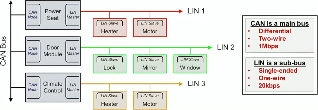 - LIN is a broadcasting, serial, one-wire interface, typically implemented as a sub-bus of a CAN network