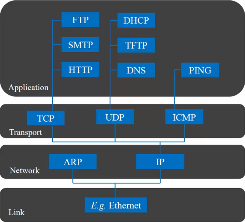 Application Layer: The link layer, network layer and transportation layer work together to reliably move data between two hosts across a network. Applications are then built to take advantage of this capability. Examples of applications include Skype, World Wide Web etc. Examples of application layer protocols include SMTP, HTTP, DNS, FTP etc. The application does not know and does not care how data gets from one host to another.