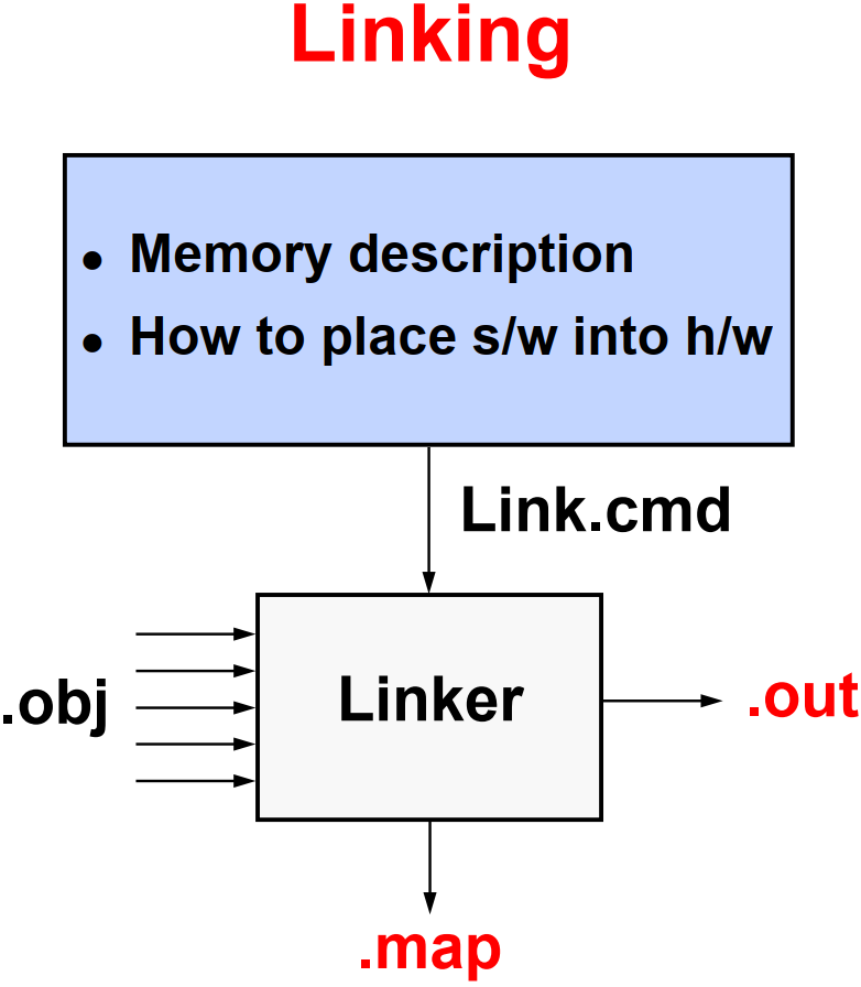 Numerous modules are joined to form a complete program by using the linker. The linker efficiently allocates the resources available on the device to each module in the system. The linker uses a command (.CMD) file to identify the memory resources and placement of where the various sections within each module are to go. Outputs of the linking process includes the linked object file (.OUT), which runs on the device, and can include a .MAP file which identifies where each linked section is located.