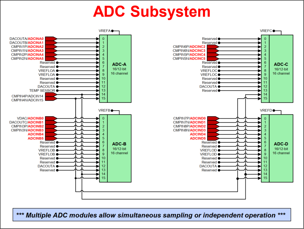 The F2837xD includes four independent high-performance ADC modules which can be accessed by both CPU subsystems, allowing the device to efficiently manage multiple analog signals for enhanced overall system throughput. Each ADC module has a single sample-and-hold (S/H) circuit and using multiple ADC modules enables simultaneous sampling or sequential sampling. The ADC module is implemented using a successive approximation (SAR) type ADC with a configurable resolution of either 16-bits or 12-bits.