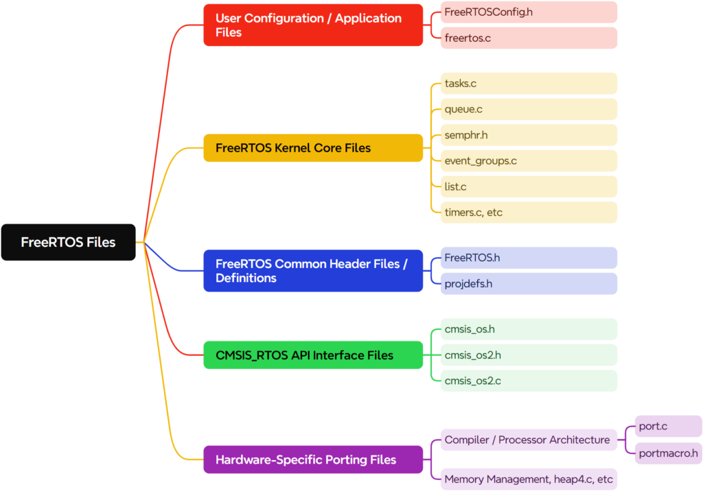 | croutine.h/.c | Source files that implement co-routine functionality. Co-routines are mainly used for very small MCUs and are now rarely used |